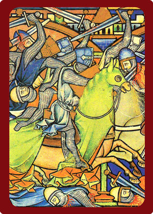 The Joust is resolved like a simple game of poker. Princes are ranked highest, Vassals are ranked second-highest, while Champions are wild and may count as either a (natural) Prince or Vassal. No other card has value. 3 of a kind beats 2 of a kind, and high card matters.