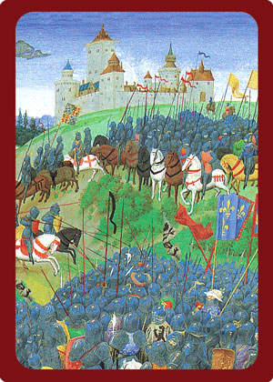 • Army Cards are killed and discarded when they take 1 point of damage, whether Infantry or Knight, and whether garrisoned with a Mercenary or in the Royal Army. Because they perish in Battle if assigned damage it generally should be allocated to them last.